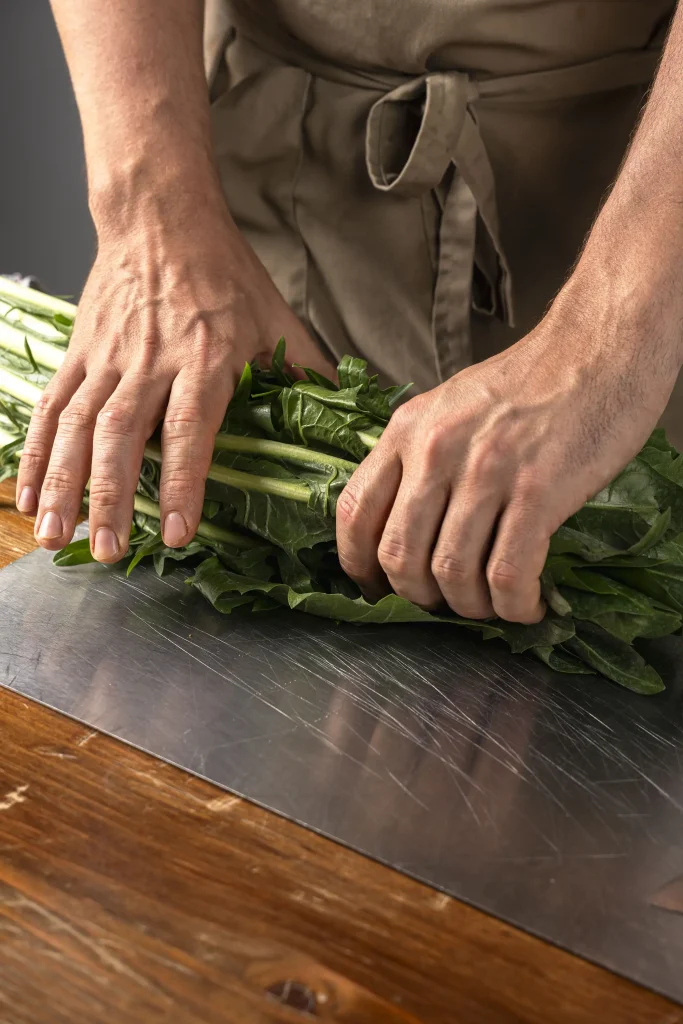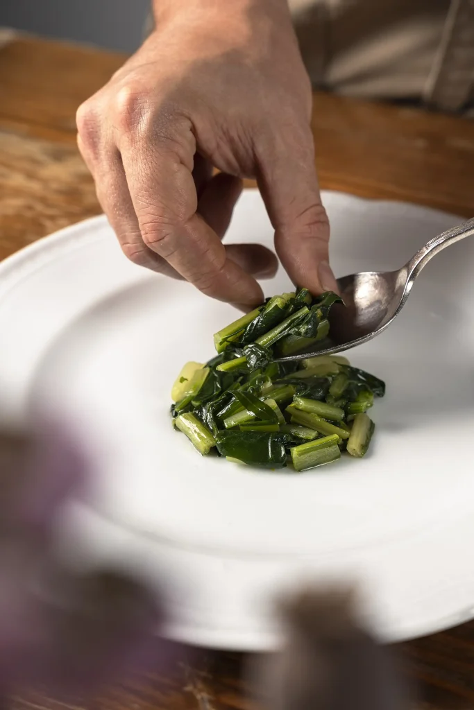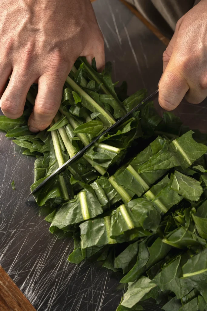 Pulite la Catalogna e tagliatela a pezzi di circa 1,5 cm. Sbollentatela in acqua salata per 3-4 minuti, poi raffreddatela in acqua e ghiaccio. Al momento di servire, ripassatela in padella con una noce di burro e un pizzico di sale.
