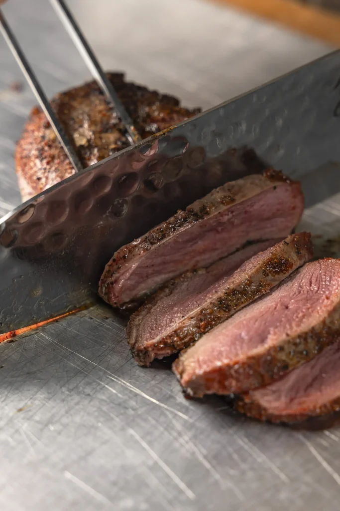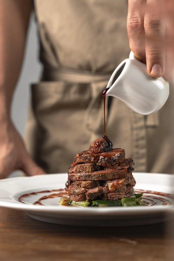 Petto d’anatra con salsa al miele e Recioto, su letto di Catalogna