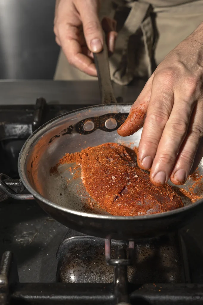 Incidete la pelle dei petti con tagli verticali, senza intaccare la carne. Preparate un mix con zenzero, paprika dolce, noce moscata, pepe nero e sale grosso. Strofinatelo sui petti d’anatra.